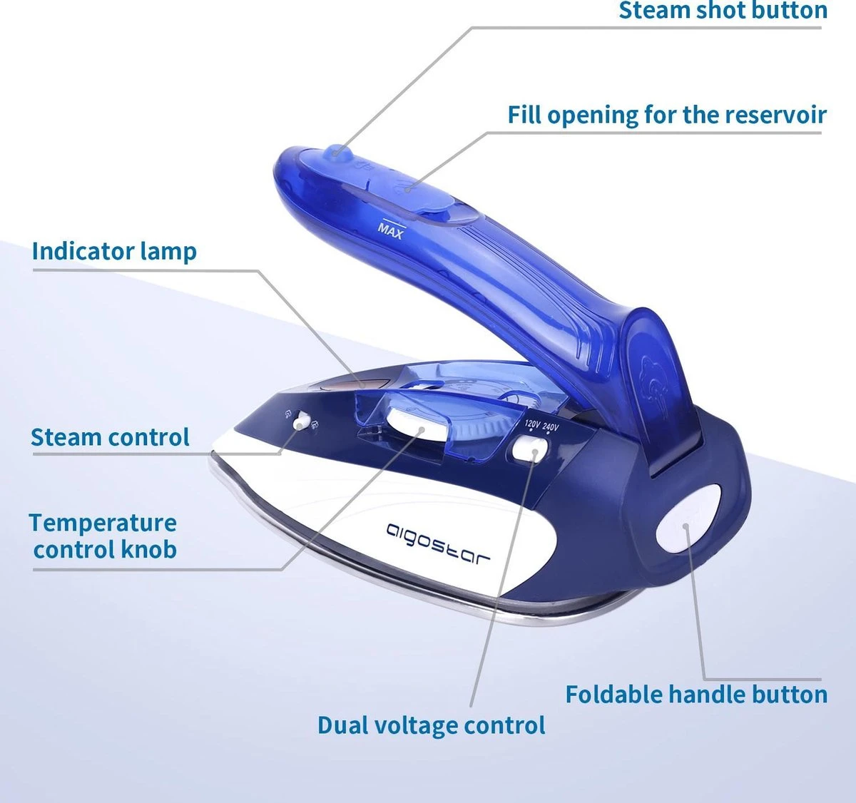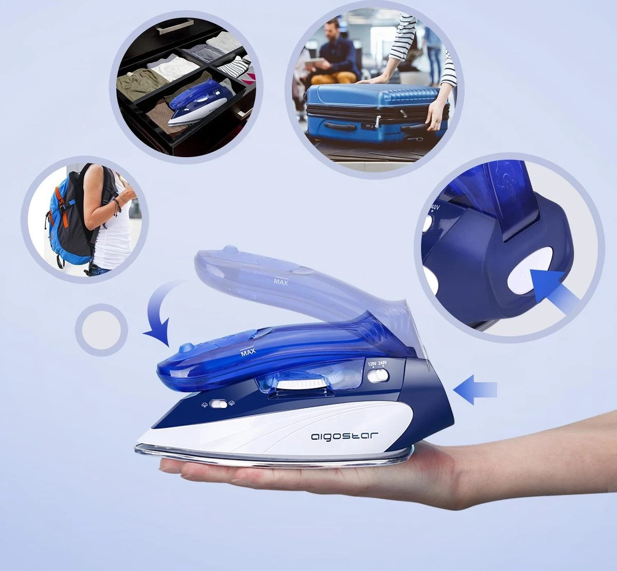 De Aigostar Lucas is een handige strijkijzer voor onderweg. Vanwege het compacte formaat en het inklapbare handvat past het in iedere rugzak en koffer. Dankzij de instelbare voltage is deze reisstrijkijzer overal te gebruiken.