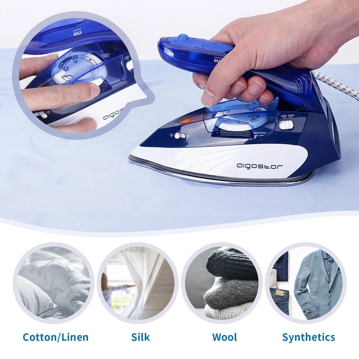 Selecteer de spanning: 110-120V of 220-240V. Dankzij het vermogen van 1100 W heb je binnen enkele minuten kreukvrije kleding.