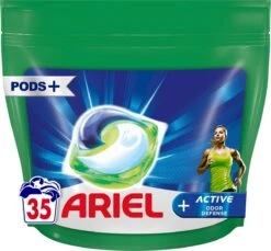 Ariel All-in-1 PODS vloeibaar wasmiddel wastabletten ‘+Active Geurbestrijding verwijderen hardnekkige vlekken en geuren en bieden 2x langere anti-geurwerking (in vergelijking met Ariel All-in-1 PODS Original). Ze bieden uitzonderlijke reiniging in een kleine wasmiddelcapsule 1. Verwijderen vlekken 2. Maken kleding stralend 3. Verfrissen 4. Beschermen stoffen 5. Ontworpen voor koudere temperaturen + anti-geurtechnologie Ariel wastabletten hebben een smart multi-ontwerp met meerdere compartimenten die de ingrediënten gescheiden houden tot ze de was bereiken. Bij contact met water lost het laagje op om krachtige vlekverwijderende technologieën vrij te geven en Ariels diepste en sterkste reiniging van All-in-1 PODS ‘+Actieve Geurbestrijding ooit te bieden. Daarnaast worden de Ariel All-in-1 PODS wasmiddelcapsules geleverd in een recyclebare verpakking. LET OP. Dit product kan schadelijk zijn en ernstige verwondingen veroorzaken. Ariel All-in-1 PODS altijd buiten het bereik van kinderen houden. Bezoek keepcapsfromkids.eu voor meer informatie.