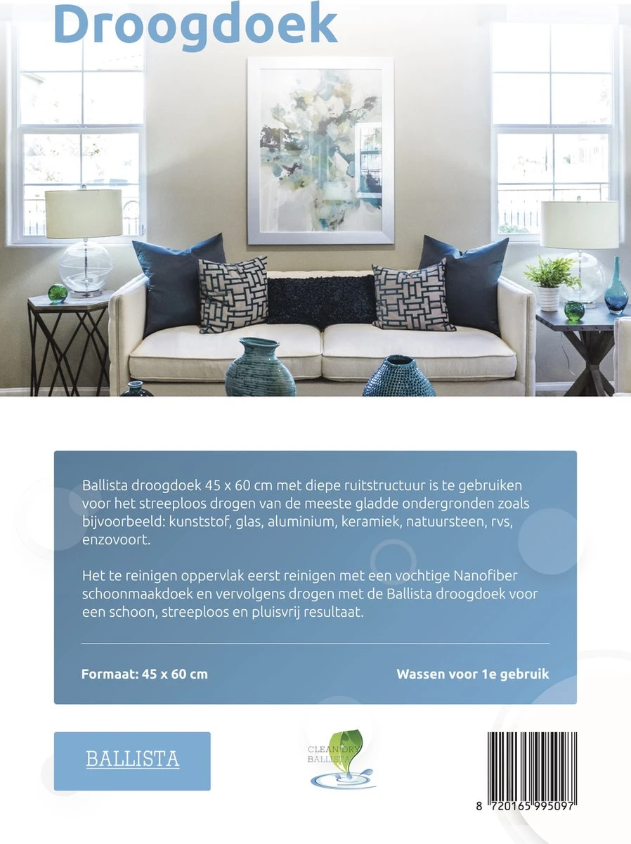 Microvezel Ballista droogdoek 45 x 60 cm. met een diepe ruitstructuur zijn te gebruiken voor het drogen van diverse ondergronden zoals bijvoorbeeld: kunststof, glas, aluminium, keramiek, natuursteen, rvs, enzovoort. Het te reinigen oppervlak eerst reinigen met de vochtige Nanofiber schoonmaakdoek en vervolgens drogen met de Ballista droogdoek voor een schoon, streeploos en pluisvrij resultaat.