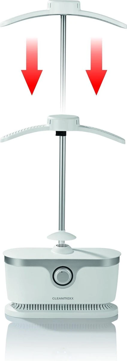 Plaats het gecentrifugeerde overhemd, blouse, T-shirt of trui over de opblaasvorm van de Cleanmaxx en met de bijgevoegde klemmen bevestigen. De timer op de gewenste duur zetten en de opblaasvorm blaast zich op en geeft tegelijkertijd warmte af aan het kledingstuk. Volledig automatisch!