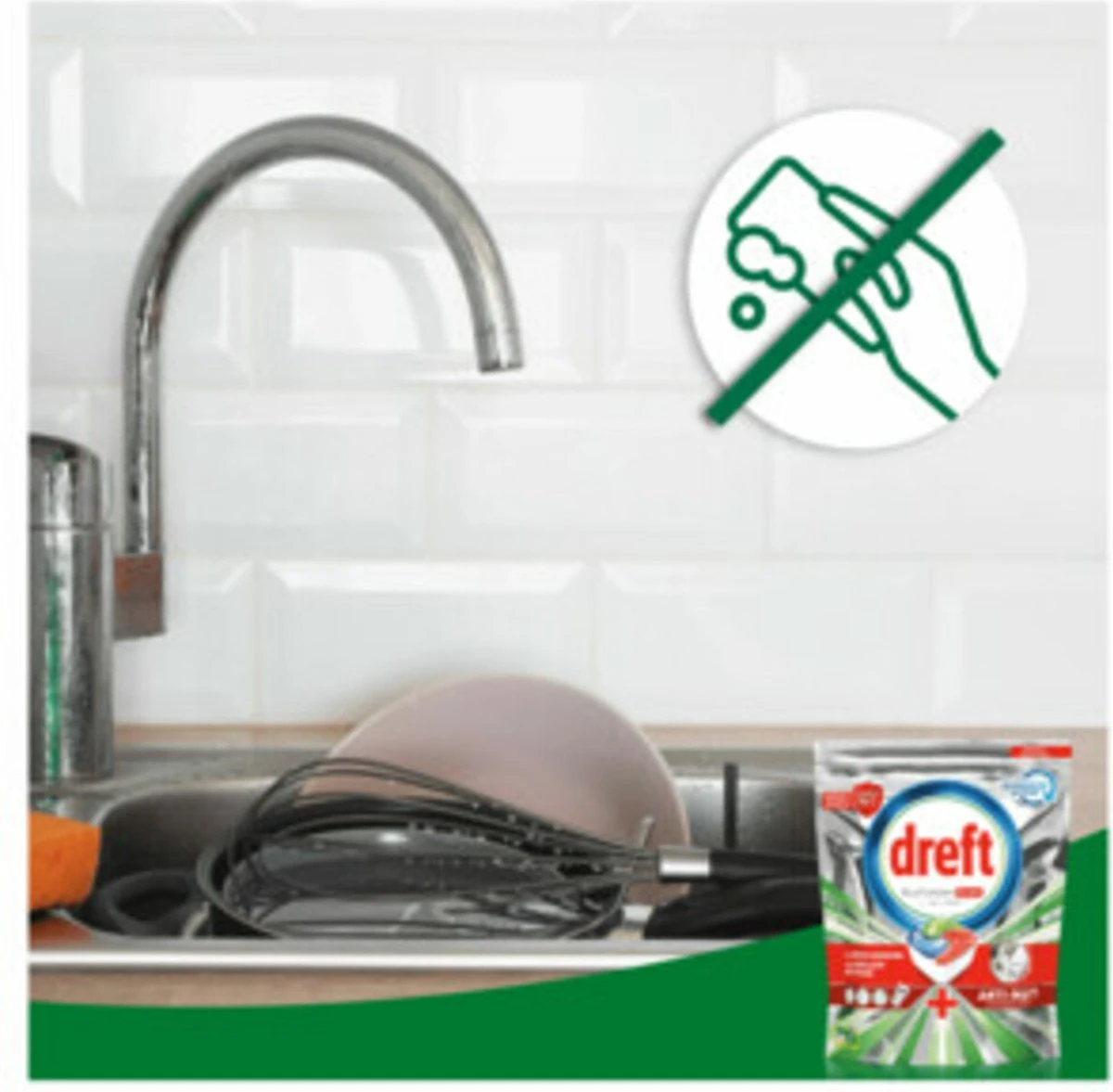 Dreft Platinum Plus All in One vaatwascapsules zorgen voor een reiniging als nieuw, het geeft je Dreft’s beste collectie voor het reinigen van hardnekkig voedsel en het helpt zelfs de dofheid weg te nemen die in de loop van de tijd is opgebouwd, om de oorspronkelijke glans van je vaatwerk te herstellen. Dreft Platinum Plus geeft je een uitmuntende reiniging en verwijdert hardnekkige voedselvlekken, zelfs in de testconditie van een korte cyclus. Dus, als je weinig tijd hebt, is er niets aan de hand. Schakel over op kort. Dreft combineert vloeistof en poeder in één krachtige capsule. Het ultra-oplosbare zakje lost snel op en werkt goed in korte cycli omdat het snel begint te reinigen om de klus klaar te krijgen. En ze zijn gemakkelijk te gebruiken. Plaats ze gewoon in het doseerbakje van je vaatwasser, met verpakking. Schakel over op de korte cyclus* en bespaar tijd, energie en water in vergelijking met een gewone, standaard cyclus!