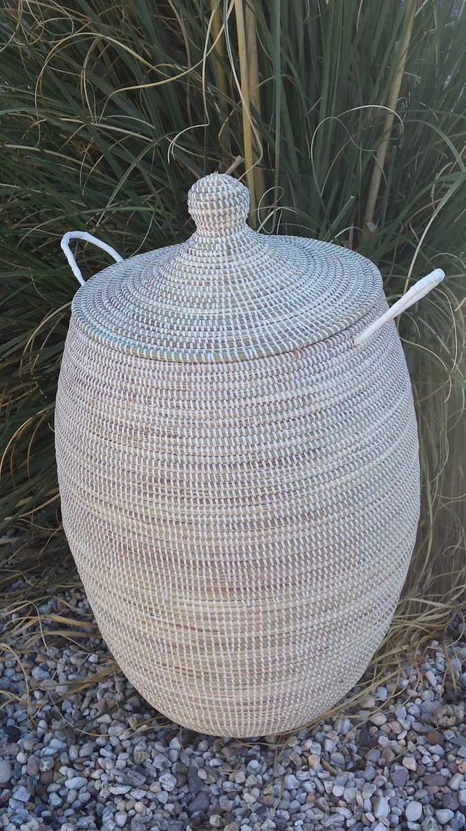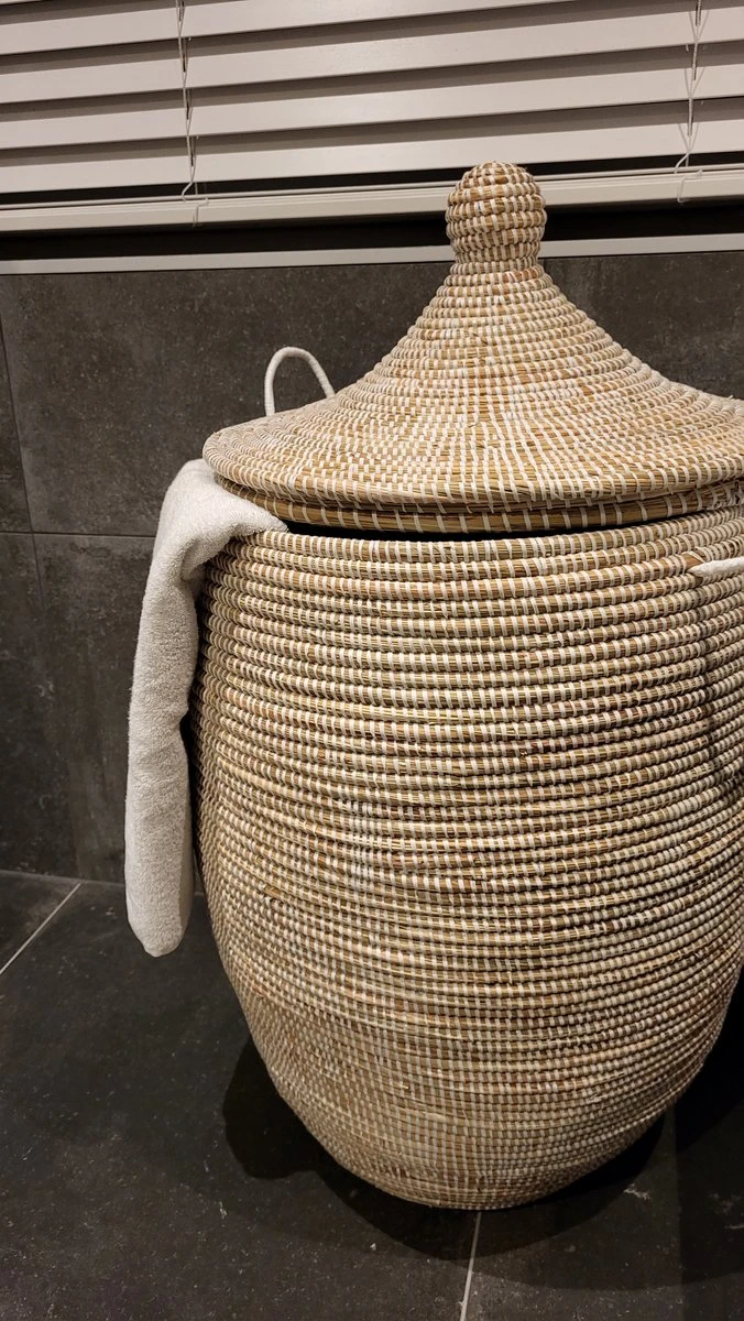 De Afrikaanse wasmand is Fair Trade, handgemaakt in Senegal van zeegras en gerecycled plastic.