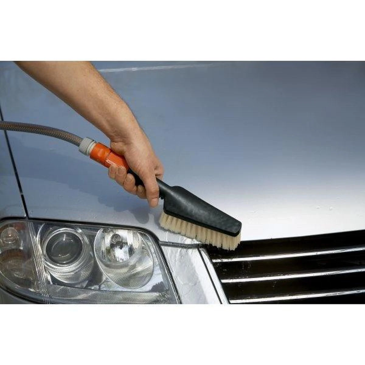 Met de kleine uitvoering van de GARDENA handwasborstel die op de watertoevoer kan worden aangesloten, in combinatie met een Original GARDENA System-aansluiting kunt u kwetsbare oppervlakken gemakkelijk reinigen, bijvoorbeeld tuinmeubilair, garagedeuren of voertuigen. Door de platte, smalle vorm komt u op alle smalle plekken en hoeken.