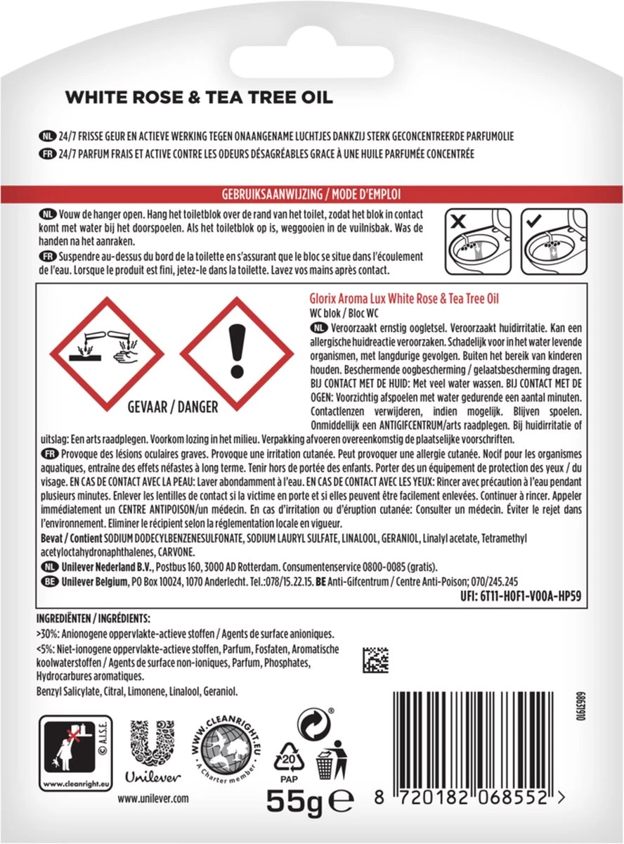 Gebruiksaanwijzing: – Vouw de hanger open. – Hang het toiletblok over de rand van het toilet, zodat het blok in contact komt met water bij het doorspoelen. – Als het toiletblok op is, weggooien in de vuilnisbak. – Was de handen na het aanraken. Met Glorix maak je je hele toilet écht schoon!