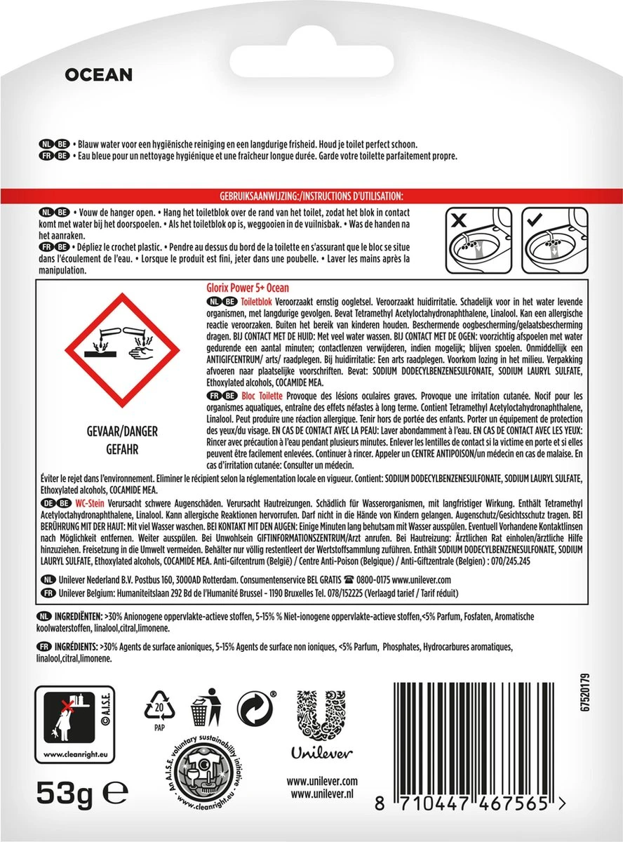 Glorix Power 5+ Ocean WC Blok met actief blauw water voor nog meer hygiëne en een frisse geur. Geef elke spoelbeurt de kracht van de nieuwe Glorix Power 5+: 1. Reinigend schuim, 2. Anti-Kalk, 3. Lang fris, 4. Glans en 5. Hygiënische reiniging. De intensieve reinigingskracht van de toiletverfrisser blijft extra lang behouden door een speciaal reservoir in het blok; het zorgt bovendien actief voor blauw water na elke spoelbeurt. Bescherm je gezin met de hygiëne van Glorix.