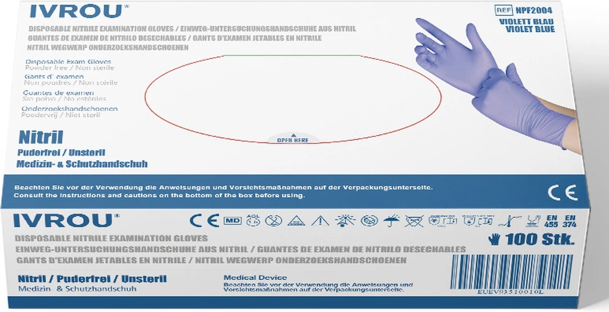 IVROU® poeder-en latexvrije nitril handschoenen zijn een medisch en industrieel product met de bedoeling de overdracht van ziekteverwekkers of bacteriën te voorkomen en de drager te beschermen tegen vloeistoffen van welke aard dan ook.