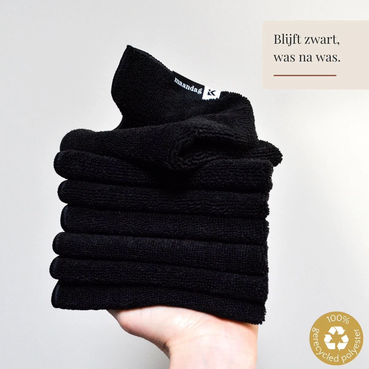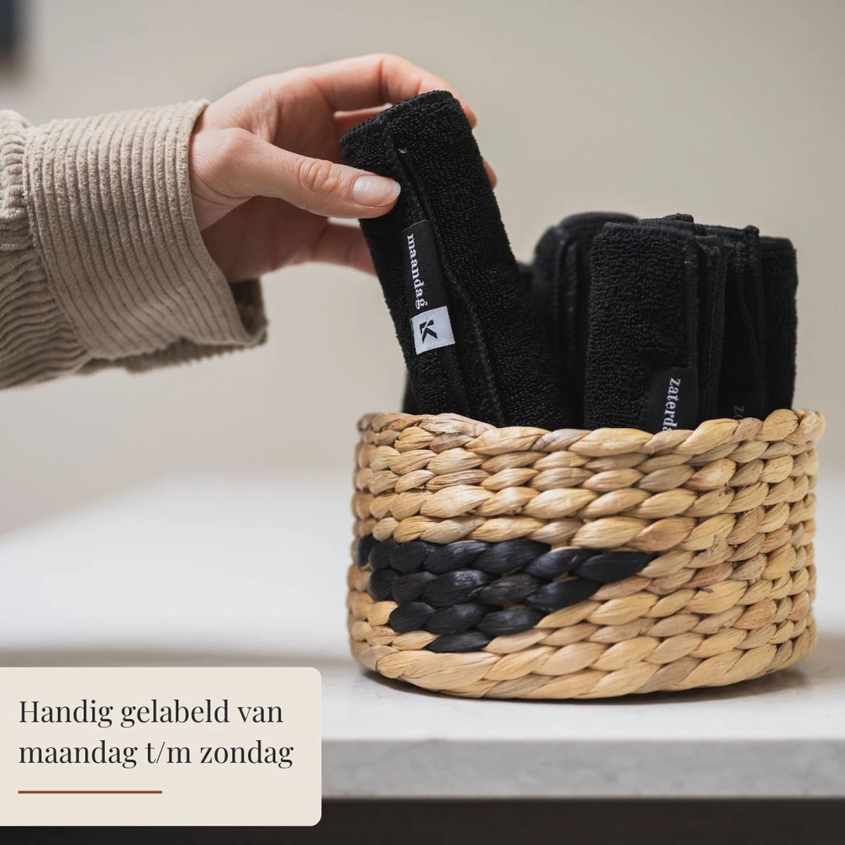 • 7 zwarte vaatdoekjes gelabeld met weekdagen