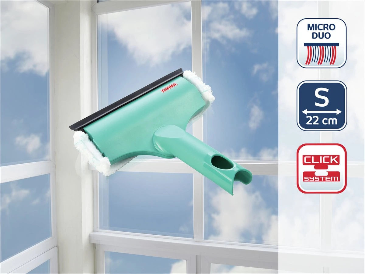 Of het nu om badkamerruiten of opgedeelde ruiten gaat: de Leifheit handruitenwisser 3-in-1 mini kan met zijn mopbreedte, van slechts 20 cm, bijna elke ruit aan. Daarbij voert hij drie werkwijzen in één uit: ramen wassen, reinigen van kozijnen en ramen droogtrekken. De unieke doek bestaat rondom uit microvezels en maakt dit mogelijk, omdat deze de zijdelingse kozijnen gelijk meeneemt. Dat spaart enorm veel tijd en moeite. Na de reiniging zorgt de geïntegreerde trekker voor een streeploze glans. Voor beweeglijkheid en maximaal bedieningscomfort beschikt de handruitenwisser over een draaischarnier. Zo is deze uitstekend geschikt voor het effectief reinigen en schoontrekken met slingerbeweging , de techniek van de professionals. De greep maakt het gebruik van een Leifheit Click-systeem-steel met telescoopfunctie mogelijk. De garantietijd is 3 jaar.