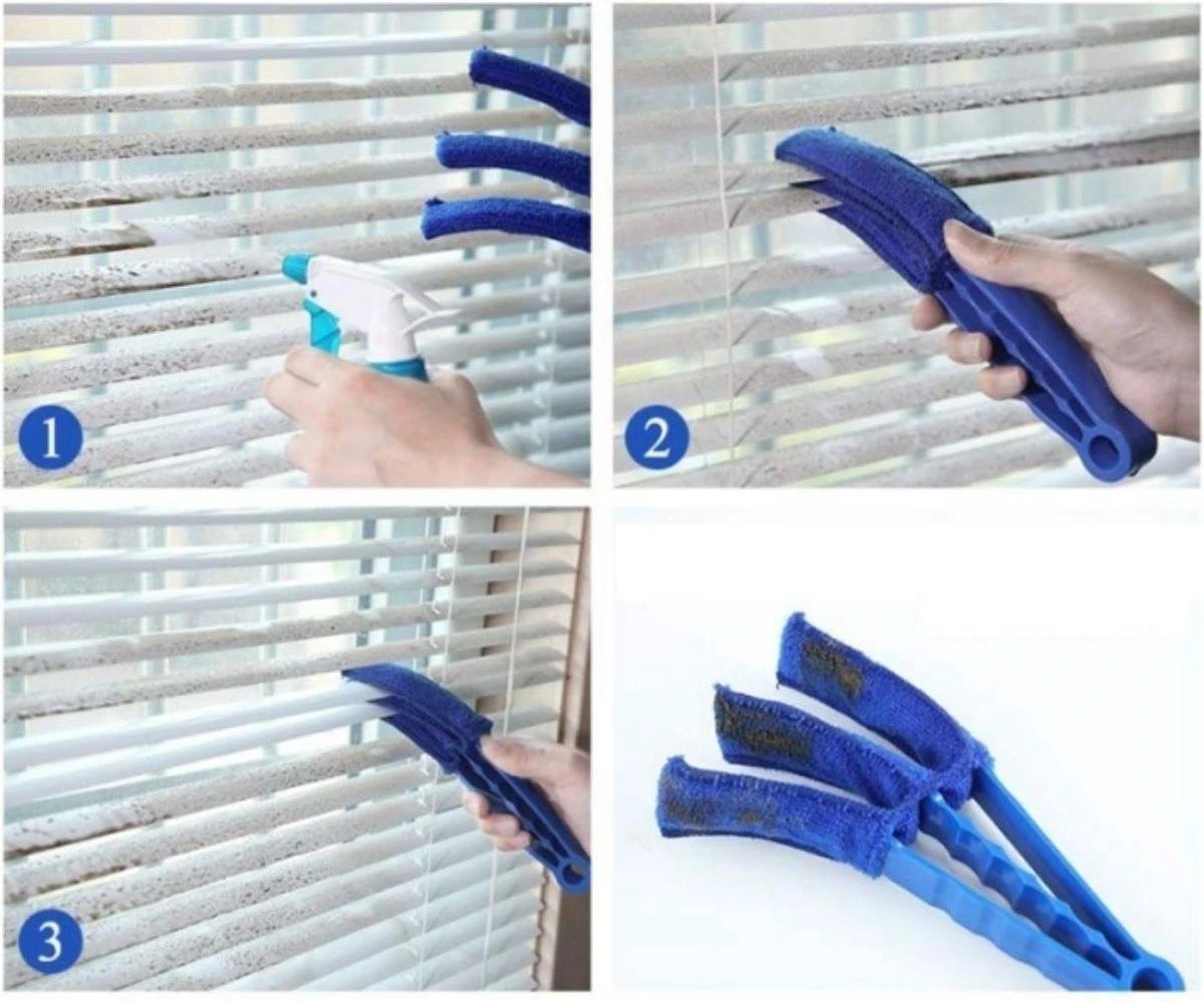 Deze schoonmaak gadget bevat drie stoffers waarmee het schoonmaken van jaloezieën een fluitje van een cent wordt. Klem de drie stoffers om de lamellen, de jaloezie of de airco heen en haal vervolgens de borstel heen en weer.