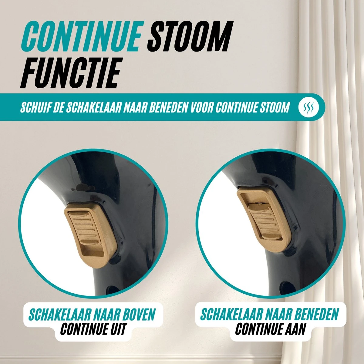 Vind je het fijn om zelf te kiezen op welk moment er stoom uit de kledingstomer moet komen? Of vind je het juist handig als de stomer continu stoomt zonder verder een knopje in te moeten houden? Door de handige schakelaar kan je gemakkelijk de continue stoom functie in- en uitschakelen. Schuif de schakelaar naar boven om zelf de stoom te reguleren. Schuif de schakelaar vervolgens naar beneden om de continue stoom functie in te schakelen. Door RYER stoom je gemakkelijk op jouw manier.